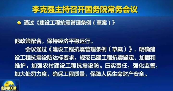 2021年5月12日,李克強(qiáng)總理主持召開國務(wù)院常務(wù)會議,通過《建設(shè)工程抗震管理條例(草案)》,明確新建、改擴(kuò)建建設(shè)工程抗震設(shè)防達(dá)標(biāo)要求及措施,規(guī)范已建成建設(shè)工程的抗震鑒定、加固和維護(hù),加強(qiáng)農(nóng)村建設(shè)工程抗震設(shè)防。